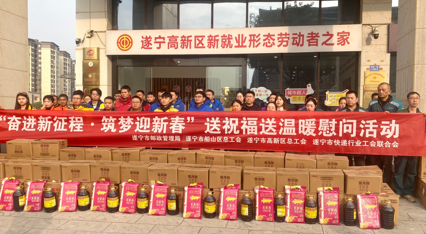 2月4日,遂宁市邮政管理局、遂宁市船山(高新)区总工会、遂宁市快递协会、遂宁市快递行业工会联合会开展“奋进新征程,筑梦迎新春”为主题的春节送温暖慰问活动,为全市